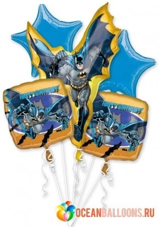 Букет "Бэтмен спешит на помощь", состоящий из 2 квадратных фольгированных шаров, большой фольгированной фигуры и 2 фольгированных звезд, очень обрадует именинника и принесет море радости!