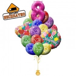 «Поздравления с международным женским днем» это букет для любих дам из 15 латексных воздушных шаров с надписью поздравления с 8 мартом, 1 фольгированного сердца, 1 фольгировонного круга и 1 большой цифры 8 ( напомним вас что фольгированный шарик цифра можно заменить ).Такой букет будет отличным подарком для любых дам с веселым, ярким и неординарным характером!