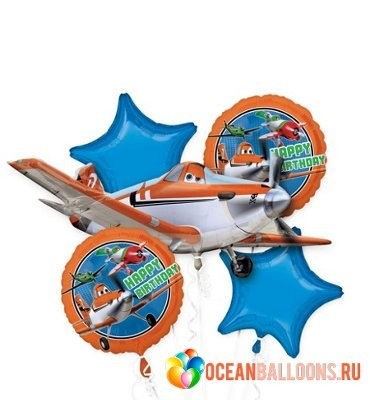 Букет "Самолеты", состоящий из 2 круглых фольгированных шаров, большой фольгированной фигуры и 2 фольгированных звезд, обязательно сделает счастливым маленького поклонника мультфильма "Самолеты"!