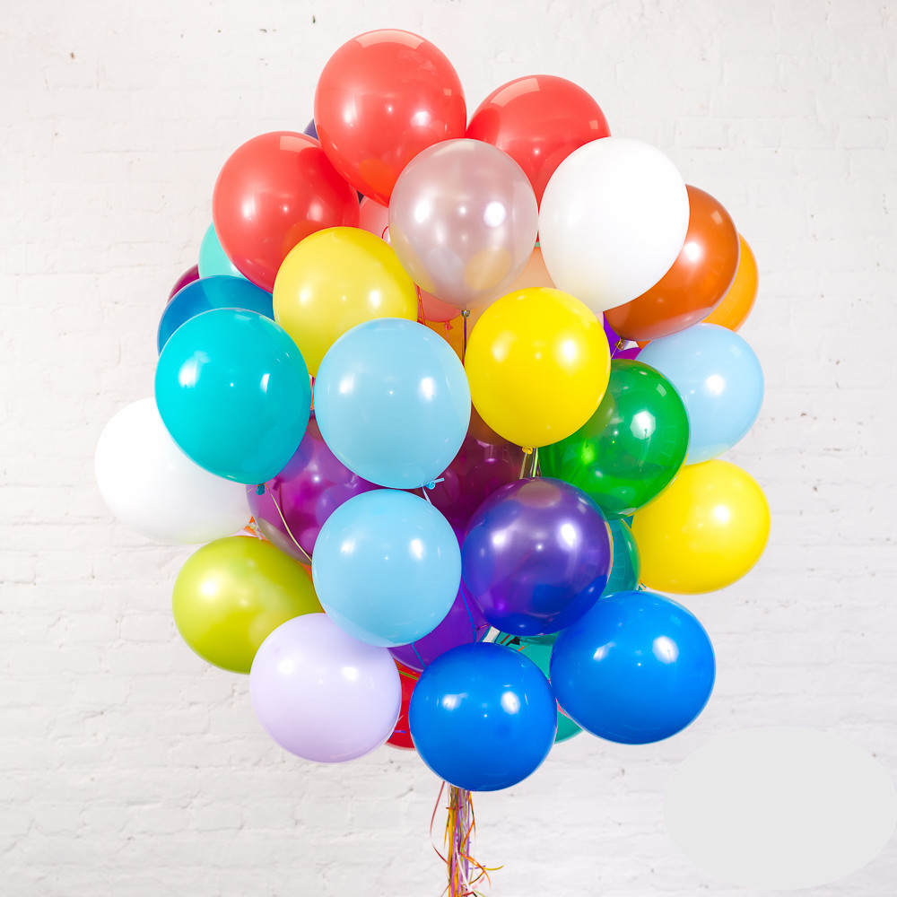 Огромное облако из 60 цветных латексных шаров, достаточное для украшения потолка просторного офисного помещения или большой жилой комнаты.